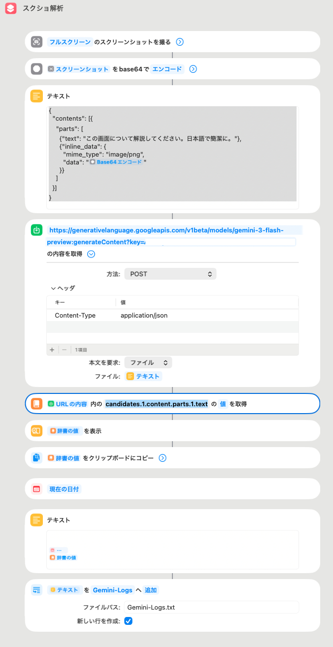 これで、スクリーンショットを撮るだけでGeminiを起動することなく回答を得られるようになりました。ただ、実際に運用してみるとアプリ版の方がレスポンスが速いため、常用はしないかもしれません。とはいえ、シチュエーション次第では非常に強力なツールになると感じています。