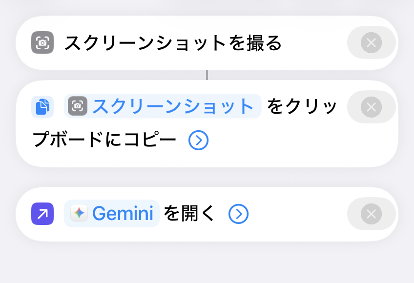 - (任意)最後に**「Appを開く」**アクションを追加し、「Gemini」アプリを選択しておくと、コピーした直後にアプリが立ち上がって便利です。